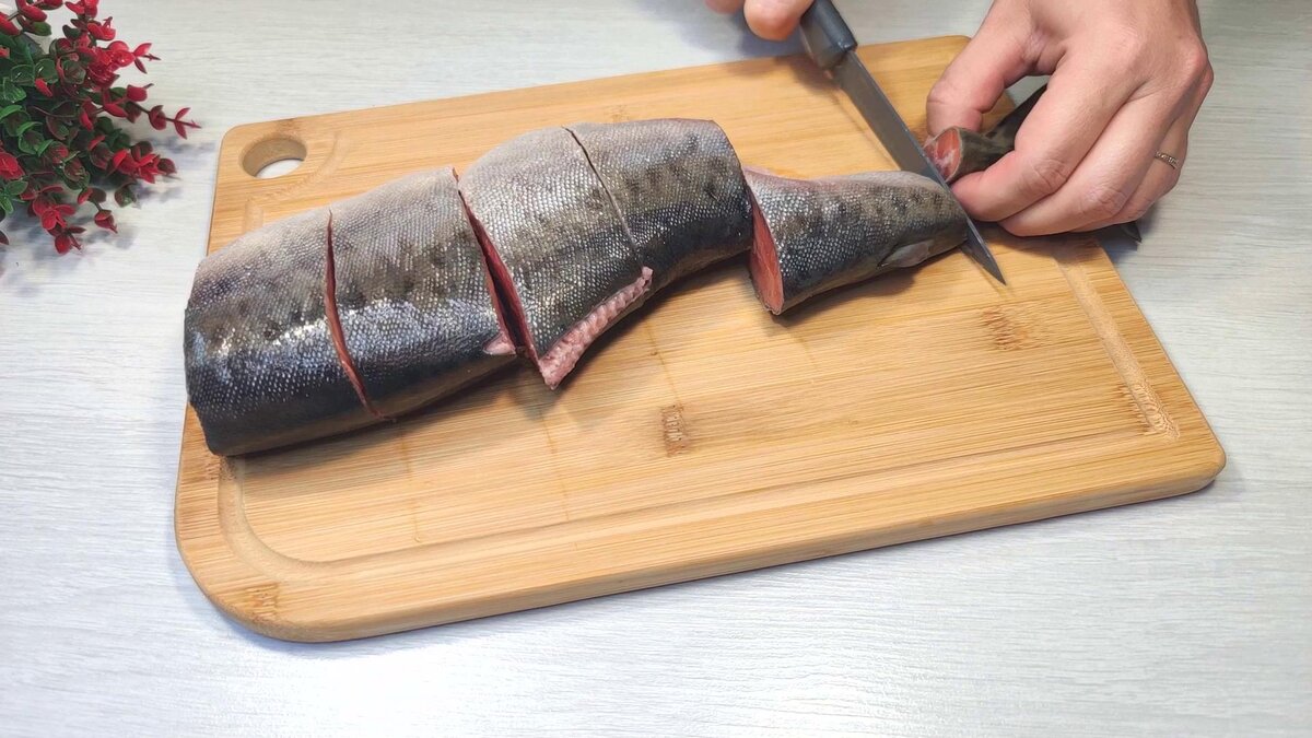 1. Горбушу очищаю от внутренностей. Отрезаю голову, хвост, плавники. Нарезаю рыбу на стейки шириной примерно 4-5 см. Кладу рыбные стейки в глубокую миску.