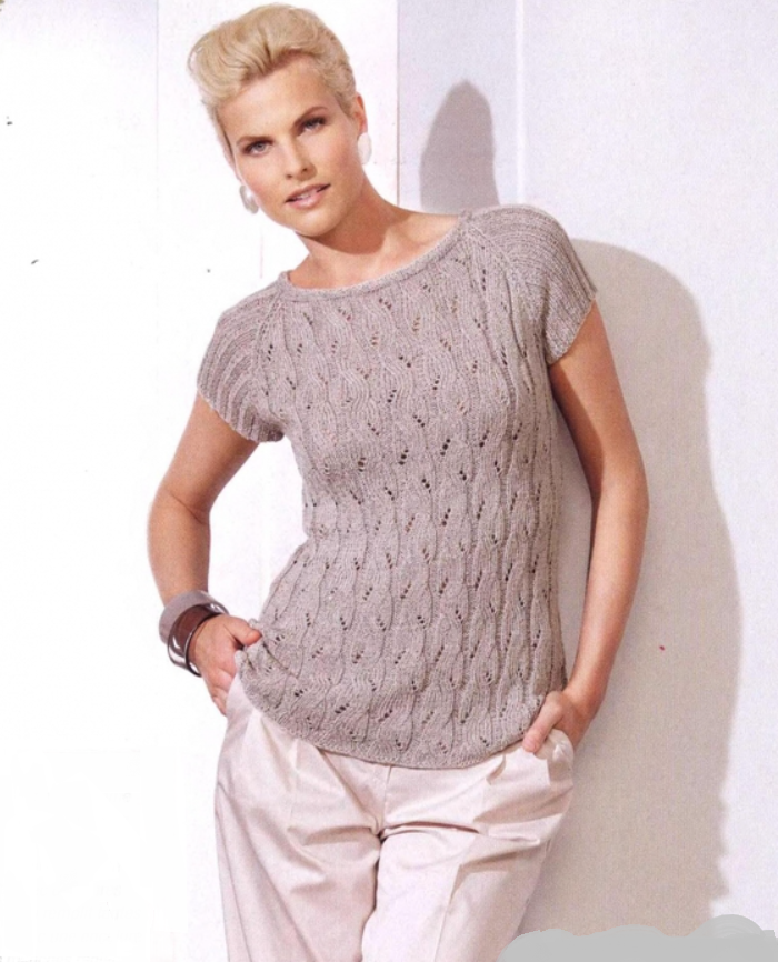 Продолжим подборки ажурных летних кофточек с коротким рукавом. Они удобны, красивы, комфортны, уместны в городском стиле и на отдыхе, хорошо сочетаются с другими видами одежды. Такие модели предпочитают многие модницы. 1. Простой ажурный узор, светлый оттенок серебристого цвета и рукава-реглан делают эту кофточку очень удобной. Рукава вывязаны полосками из лицевых и изнаночных петель. Начало обзора здесь >>>>>> 2. Еще одна модель с рукавом реглан. Тоже красивого серого цвета. В отличие от первой кофточки в этой модели рукава цельновязанные. Узор из нежных листочков дополняет образ. В сегодняшней подборке лидируют кофточки серого цвета. Видимо, не зря. Серый - цвет элегантности, он хорошо сочетается со многими другими цветами. Например, эта кофточка будет превосходно смотреться с белыми классическими брюками или джинсами. 3. Ажурные "паучки" добавят романтики образу с этой кофточкой. 4. Простая геометрия этой кофточки обращает на себя внимание. Строгий узор на основе ажурных ромбов и