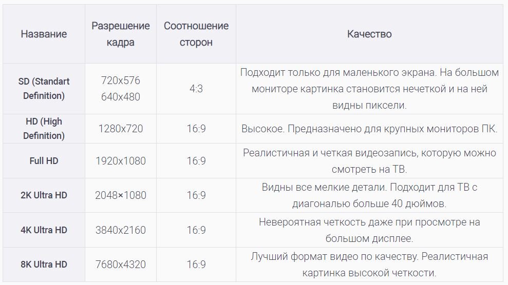 Формат видеофайла для съемки видеоролика выбирайте MOV. Устанавливайте в настройках камеры наивысшее разрешение, например 2К или 8К. На компьютере можно будет в любой момент уменьшить размер кадра без снижения детализации и четкости. При увеличении картинки будут появляться видимые пиксели, цифровые шумы и т.д. Лучший формат видео для телефона (Андроид и Айфон) Сп