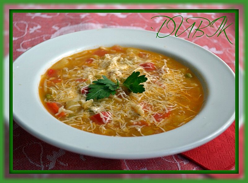 Необыкновенно вкусный, ароматный, густой и довольно сытный супчик. Ингредиенты Способ приготовления Картофель очистить от кожуры и вымыть. Стручки сладкого перца очистить от семян. Лук-порей вымыть. Помидоры обдать кипятком и очистить от кожицы. Нарезать кубиками помидоры, картофель и сладкий перец. Лук-порей нарезать крупными кольцами ( я брала даже немного зеленой части ). Чеснок очистить и порубить. Кубики картофеля, сладкого перца, лук-порей с чесноком обжарить в растительном масле. Добавить помидоры, потушить. Выложить овощи в кастрюлю. Влить бульон и варить под крышкой в течение 10-12 минут. Через 5 минут после начала варки добавить вермишель и горошек. Приправить по вкусу солью, молотым черным и красным перцем. Разлить суп по тарелкам и посыпать тертым сыром. ПРИЯТНОГО АППЕТИТА!!!