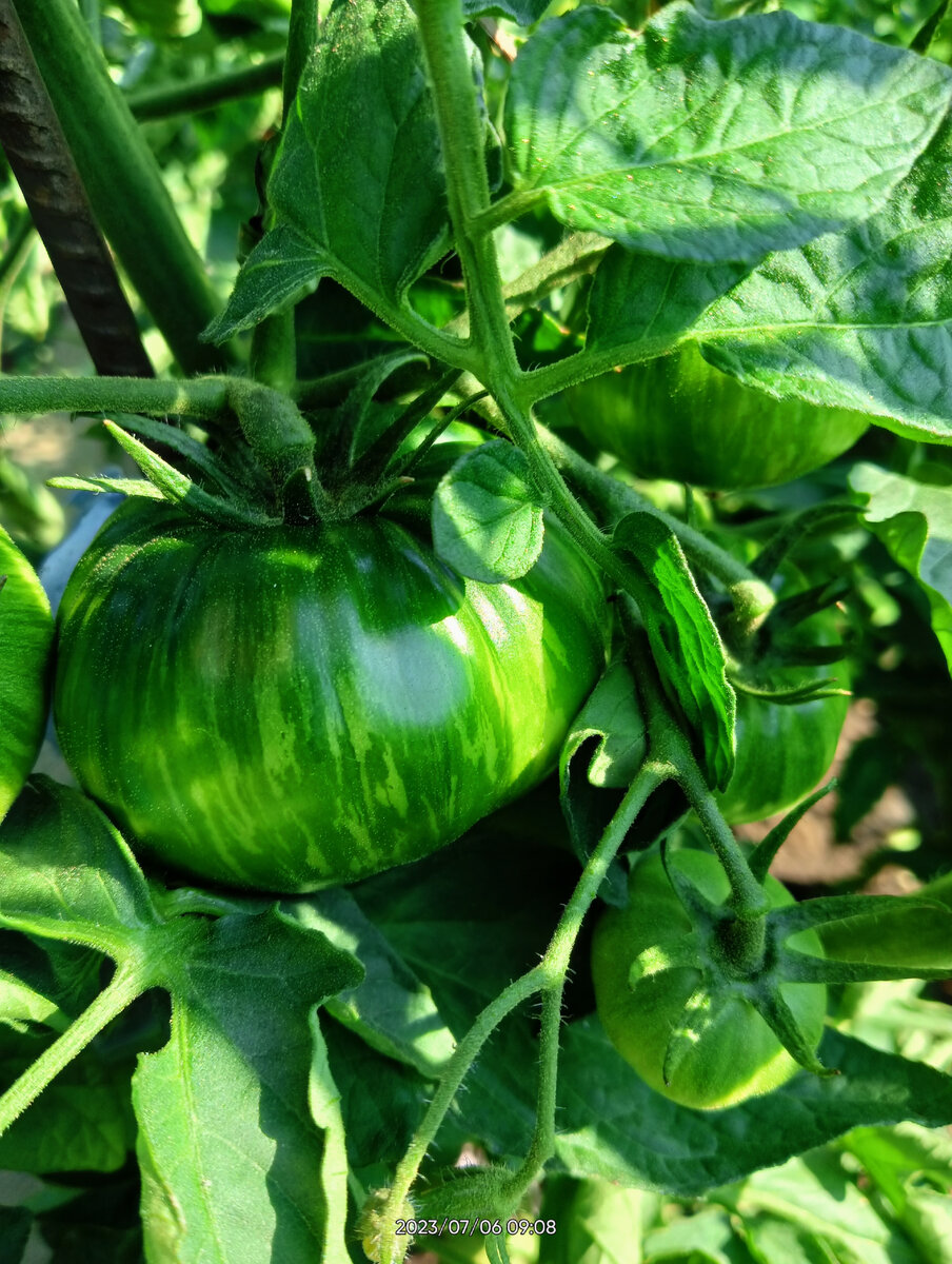 Всем привет! Как всегда, начну с томатов.. Первый раз в этом году посадила "Полосатый шоколад" от Партнёра. Индент с плодами интересного окраса: густо-оранжево-бордовый цвет с оливковыми полосками и штрихами.. А пока это выглядит вот так.. Вкус обещает быть десертным, сладким, с насыщенным фруктовым ароматом! Кусты мощные и высокие.. "Зелёная тайна личинки" от Партнёра! Индент.. Плоды зеленовато-янтарной окраски. Листья картофельного типа.. Пока только зелёные.. Обещают сочные, сладкие, ароматные плоды.. "Сумасшедшие вишни Барри". Обильные, сладкие, жёлтые черри овальной формы! Вот такой раскидистый куст.. Ожидание сладкого, фруктового вкуса! Про томаты пока всё! Сегодня я выкапывала чеснок! И посмотрите, что за "пирамидка" у меня выросла!) Это единственный экземпляр.. Верхняя чесночинка, как бусинка, двигается вдоль стволика! Первый раз такое вижу! Что за диво? Чёрная смородина у меня в этом году лежит ковром на земле под тяжестью ягод.. Все опоры я покрасила и определила на клумбу!