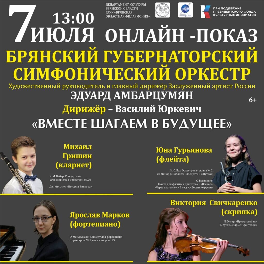 Брянская областная филармония предлагает вниманию онлайн-показ концертной программы концертной программы «Вместе шагаем в будущее» Брянского Губернаторского симфонического оркестра, под управлением художественного руководителя и главного дирижёра заслуженного артиста России Эдуарда Амбарцумяна. Онлайн-показ состоится в пятницу, 7 июля. Начало в 13 часов. В концерте принимают участие стипендиаты Международного благотворительного фонда Владимира Спивакова – Юна Гурьянова (флейта), Ярослав Марков (фортепиано), Виктория Свичкаренко (скрипка) и Михаил Гришин (кларнет). Дирижёр – Василий Юркевич. Об этом сообщает Брянская областная филармония. 6+ ФОТО: Брянская филармония Брянцев приглашают на онлайн-показ концерта «Вместе шагаем в будущее»