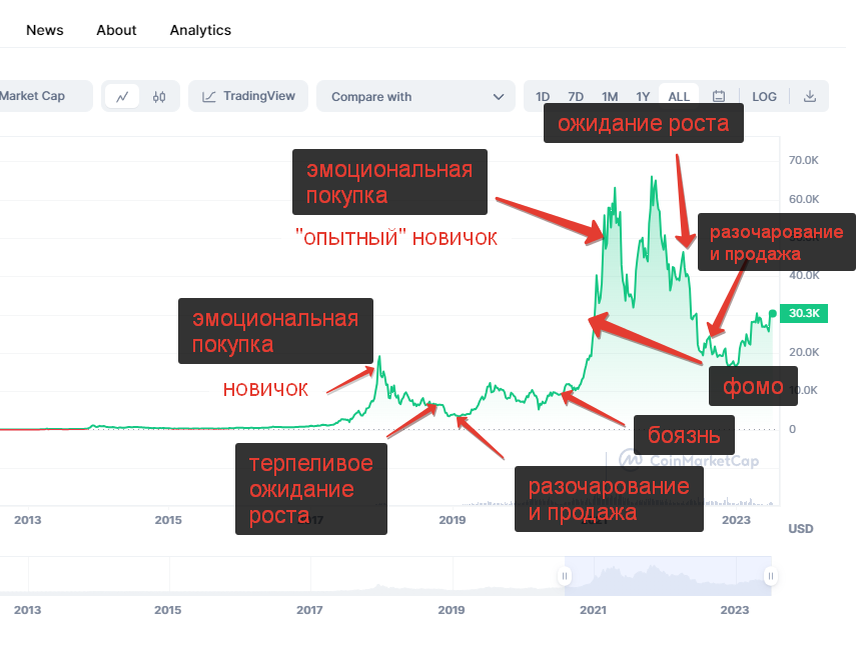 - Начинается новый цикл, но новичку страшно покупать, он либо ждёт падения ещё ниже, чтобы подобрать цену на "днеднанаднедна",