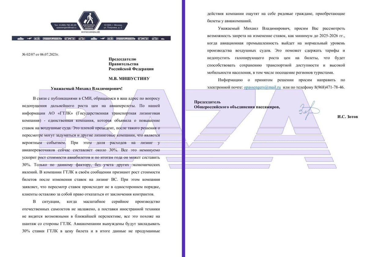 По словам Зотова, в ситуации, когда в России пока не налажено серийное производство самолётов, а о поставках иностранной техники думать не приходится, всё это выглядит, как шантаж со стороны ГТЛК. В письме председатель ООП просит Михаила Мишустина рассмотреть возможность запрета на изменение ставок до 2025-2026 года.