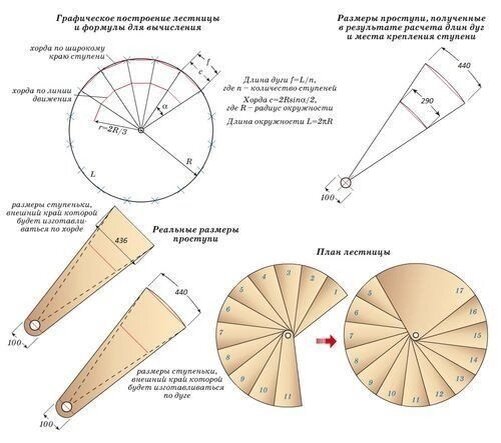 Винтовая лестница – конструкция сложная и требует серьезного подхода. Обычно такую работу доверяют профессионалам, но если вы все-таки решились на сооружение винтовой лестницы своими руками, то начать стоит с проектирования и расчета. Для начала необходимо определиться с типом конструкции, которую мы в последствие рассчитаем. Конструкция с боковой опорой требует «колодца», в стены которого будут встроены ступени, либо спиралевидной тетивы. Второй вариант отпадает сразу – спиралевидную тетиву своими силами изготовить сложно. «Колодец» в принципе можно соорудить, если это не противоречит общей концепции проекта. В ином случае лучше сделать своими руками вариант с центральной опорой на обсадную опору. Роль обсадной опоры может играть стальная труба диаметром 6-8см с толщиной стенки не менее 5мм. Каркас консолей можно сварить из стального уголка. Материалом для самих ступеней-консолей станет деревянный массив. Расчет конструкции Винтовая лестница в плане представляет сбой правильную окр