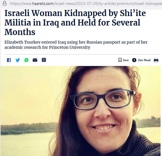 История с арестованной в Ираке израильтянкой стала сегодня одной из главных теми израильских СМИ. Напомню, что Лиза Цуркова, эмигрантка из России, давно живет в Израиле, занимается журналистикой и имеет два паспорта, российский и израильский. Несколько месяцев назад она полетела в Ирак, чтобы сделать репортаж про про древний Вавилон. Учитывая, что Израиль и Ирак не имеют дипломатических отношений и более того, имеют крайне плохие отошения, она использовала свой российский паспорт. Через какое-то время ее арестовали в Ираке и затем она вовсе исчезла, а затем иракские джихадисты заявили, то теперь израильтянка в их руках. Подчеркну, что для них эта девушка - заложница израильтянка и им нет дела, сколько у неё еще паспортов помимо израильского, они угрожают отправить ее в Израиль по частям. Власти Израиля на эту ситуацию реагировали мягко говоря странно. Вначале не было никакой реакции вовсе и близкие и друзья девушки бились во все официальные двери и в СМИ, умоляя что-то предпринять. Вл