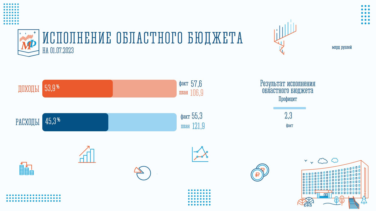 По последним данным, на 1 июля 2023 года исполнение областного бюджета отражает следующую картину: доходы областного бюджета составляют 57 604,0 млн рублей, что составляет 53,9% от утвержденного на текущий год объема.