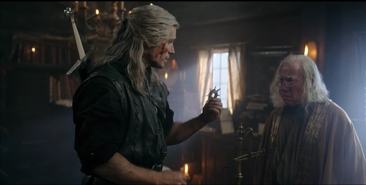 В этом эпизоде всё шиворот навыворот, и я даже понимаю почему – приходится подстраиваться под то, что намудрили ранее, а ввести этих персонажей нужно, чтобы это хоть как-то мимикрировало под оригинал «Час презрения». И замена карлика Фэнна на рыжую старушку далеко не самая главная претензия. Итак, Геральт и Лютик подходят к двери. Из замка выскакивает острый штырь … В оригинале ловушка срабатывала только в том случае, если замок пытались взломать (вот это логично), а не постоянно. Но Геральт (зная о ловушке) просто не держался настороже на всякий случай - а вдруг она сломается? (И точно – она накануне и, правда, сломалась, ненароком убив старьевщика).