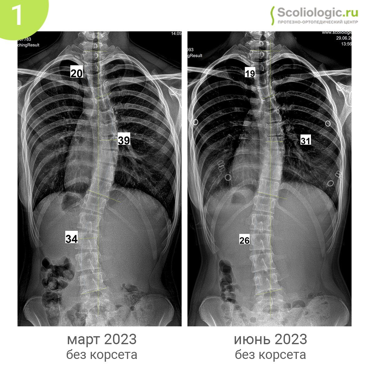 Пациентка, 16 лет. В марте 2023 года пришла в Сколиолоджик.ру первый раз с градусами 20-39-34.