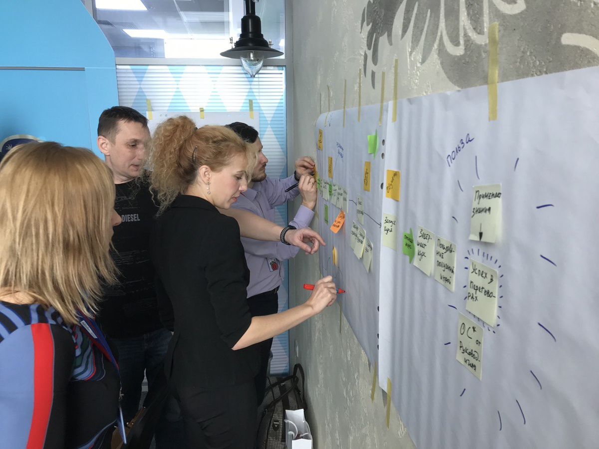 Должно получится что-то вроде карты процесса с выстроенными по строчкам стикерами. В качестве рабочего пространства можно использовать виртуальную доску Miro (там существуют готовые шаблоны) или расклеить стикеры на листе флипчарта.