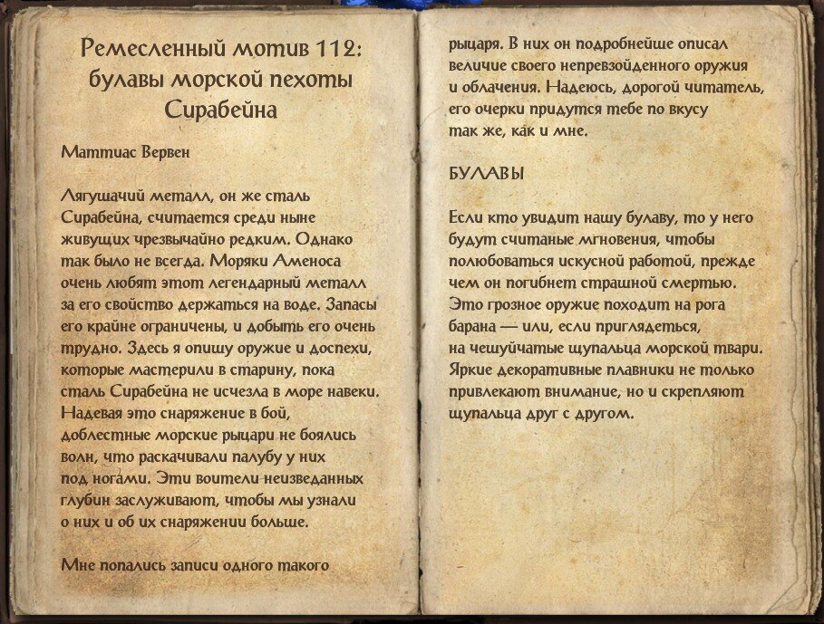 Лягушачий металл, он же сталь Сирабейна, считается среди ныне живущих чрезвычайно редким. Однако так было не всегда. Моряки Аменоса очень любят этот легендарный металл за его свойство держаться на воде. Запасы его крайне ограничены, и добыть его очень трудно. Здесь я опишу оружие и доспехи, которые мастерили в старину, пока сталь Сирабейна не исчезла в море навеки. Надевая это снаряжение в бой, доблестные морские рыцари не боялись волн, что раскачивали палубу под их ногами. Эти воители неизведанных глубин заслуживают, чтобы мы узнали о них и об их снаряжении больше.