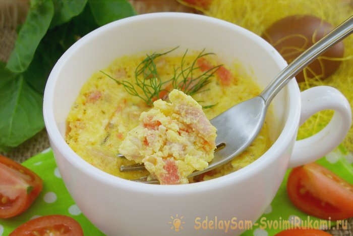 Микроволновка значительно упрощает хозяйкам жизнь, экономит время, и позволяет создавать интересные блюда. Так, чтобы сделать омлет, понадобится две минуты, и при этом не придется мыть сковородку и тарелку. Сегодня на завтрак будет омлет в кружке в микроволновке. Все получится быстро, вкусно и необычно. Первый раз, конечно, придется понаблюдать за процессом, чтобы не передержать, но впоследствии участие хозяйки будет сведено к минимуму. Обязательно попробуйте, и вы будете готовить такое блюдо еще не раз. Ингредиенты: Порядок приготовления полезного и быстрого завтрака Подготовить все необходимое. В кружку, пригодную для микроволновки, выложить сливочное масло. Поставить в печку на пару секунд, чтобы оно растаяло. Высыпать нарезанные небольшими кусочками помидоры. Сыр. И ветчину. Разбить яйцо. Приправить солью и травами. Перемешать вилкой. Содержимое не должно занимать более двух третей объема кружки. Поставить в микроволновку на максимальную мощность, здесь это 800 Вт, на одну минуту.