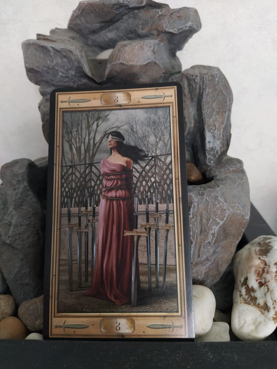 Посмотрите внимательно на эту карту. 8 Мечей. Женщина со связанными руками и завязанными глазами стоит среди воткнутых в землю мечей. Связанная, она выбралась из крепости. Её свободу ничто не ограничивает. Повязку легко снять, от пут, веревок легко освободиться, стоит лишь пошевелить плечами, а мечи не преграждают путь, но женщина всё равно ощущает себя пленницей. Это карта означает ступор, блокаду, ограничение. И вы создали его сами. Если у вас есть сейчас ощущение что вы попали в ловушку, и не знаете что делать, возможно, так сложились обстоятельства. Но как правило сковывающими являются не Внешние факторы, а надуманные страхи и комплексы самого человека. В любом случае текущая текущая ситуация - это результат ваших собственных действий, что заслужили то и получаете. Эта карта указывает на область жизни, где мы не чувствуем себя уверенно и решили отказаться от чего-то, либо вам в чём-то отказали. Совет на сегодняшний день говорит о том, что самое серьёзное препятствие для продв