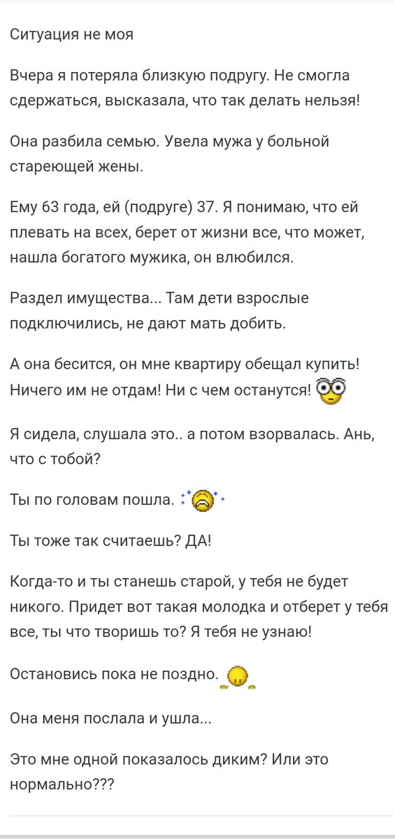 😞😑 Я не великий моралист. Но прочитав эту историю, я не могу остаться равнодушной⬇️ С одной стороны, это мужчина разбил семью. Он принял решение изменять той, с кем всю жизнь прожил. Той, которая ему детей родила. Той, которая разделила с ним не только радости, но и горести🥺 Этот представитель мужского пола мог с любой другой женщиной связаться. Мужчин и не нужно уводить — они сами бегут из семей👞 Но с другой стороны. Подруга нашей героини никаких прав на совместное имущество не имеет. Не она строила всё, и не ей передавать дальше своему потомству. Забирай мужика. Окей👐 Такой мусор семье не нужен🗑️ Но уж наживай богатство теперь с ним отдельно от его семьи🤷♀️ И вот как некоторые не боятся, что семья мужика подловит и обольет кислотой, не понимаю😬 Никто не бессмертен. Знаю случаи, когда уводили мужиков. И мужики потом одаривали любовниц долгие годы. Но, однако, и прошлой семье в свое время оставили наследие. Но бывают мерзавцы, которые даже и детей хотят лишить всего, лишь б