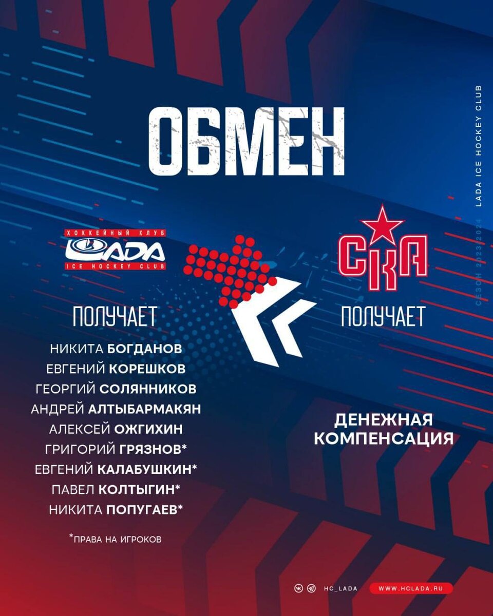 Сразу 9 хоккеистов отправляются в Тольятти из Петербурга Никита Богданов, Григорий Грязнов, Евгений Калабушкин, Евгений Корешков, Георгий Солянников, Андрей Алтыбармакян, Павел Колтыгин, Алексей Ожгихин и Никита Попугаев — продолжат карьеру в «Ладе»