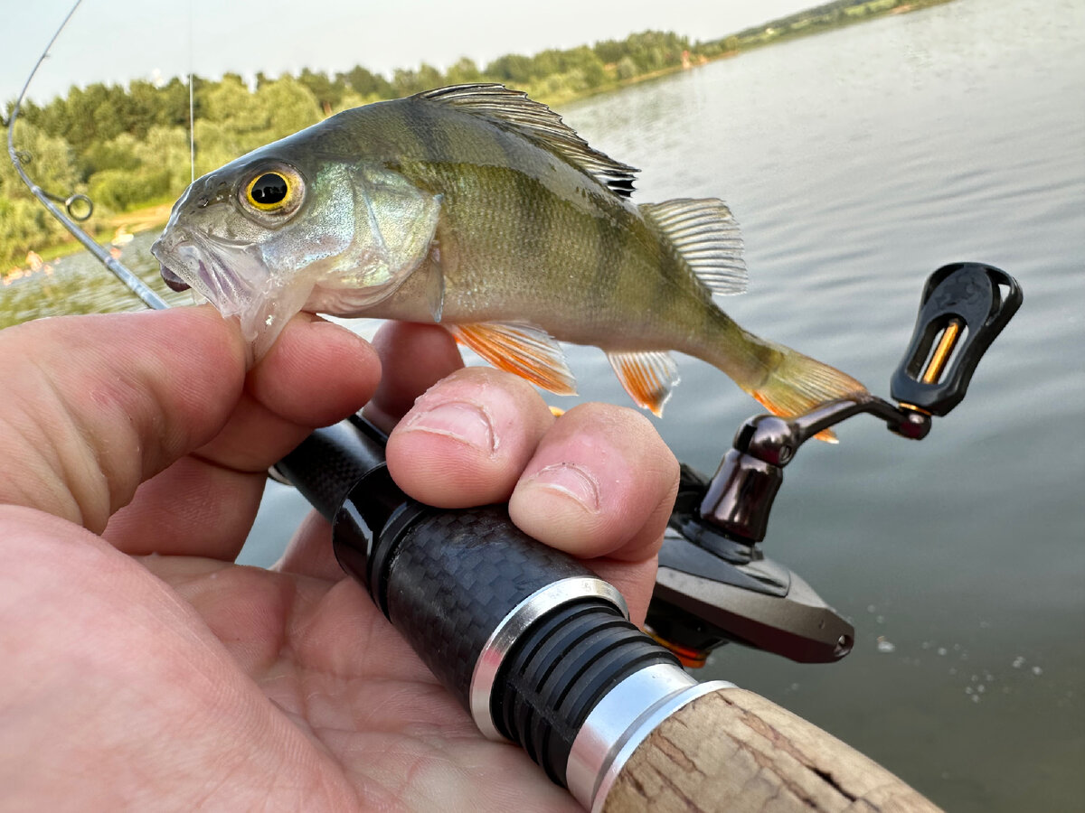 Вчера после работы заехал на пару часиков на Жестылёвское водохранилище проверить окуня.На первой точке было пару невнятных тычков и один прозрачный окунёк. Решил сменить место,переехал в самый угол водохранилища,там много растительности в воде и глубина значительно меньше.И действительно,приехав на точку сразу было видно что окунь сейчас охотится.Вода буквально бурлила а малёк большую часть времени проводил в воздухе)Первый заброс и сразу окунь,второй,третий,пятый,десятый и понеслось.Окунь брал на поверхности или в полводы,вид и цвет резины не имел значения,только вес.Самый подходящий вес был 0,75 грамма с резиной Nano Minnows в разных цветах,поводок из 0,14 Флора. На одном забросе сразу последовал удар,хотя мормышка только коснулась воды,ни чего не обычного такое часто бывает,но!Протащив пару метров полосатого я почувствовал ещё один,куда более сильный,удар.Фрикцион визжит,а по поверхности воды ударил мощный щучий хвост.Я даже ни стал пробовать вытащить её на берег,снасть не та,да и