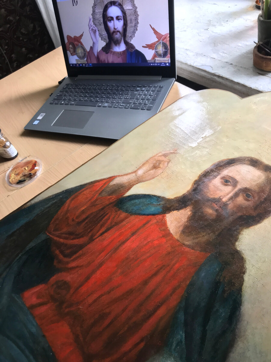 покажу значимые стадии немного позже. А пока - вот прописывала утраченную , затёртую ручку, поискала аналог благословляющей длани на бездонном пинтересте - и получился такой выразительный кадр ) Икона огромная, возиться с ней ещё порядком. Разместила рядом - тоже из соображений технологически-эстетических - отшлифованный спил породы, лазурит, отчасти перерождающийся в малахит. Подарили мне его замечательные люди, привезён он с волшебного Урала, куда рвётся вся моя душа. Колористическое сходство с драпировками на этой иконе очень подкупает. Мои краски - отличного японского качества, профессиональной линейки - выглядят так, будто вырезаны из этого кусочка породы. Вот так и проходят рабочие дни, одна икона интересней другой, и конца им нет. Спасибо, что смотрите. И ставите сердечки.