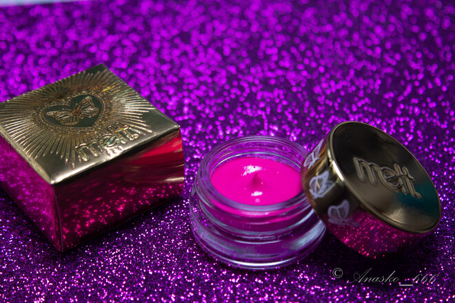 На очередной распродаже я схватила две подводки: изумрудную и ярко-розовую гелевые подводки. В баночке 2,5 мл, срок годности после вскрытия 12 месяцев. Цвет шикарный: яркий, практически неоновый, розовый. Текстура легкая и мягкая, при этом работать с подводкой не особо удобно. Она будто цепляется за все, на что наносится, как результат не особо плавная, немного рваная стрелка. С однородностью у данного оттенка уже значительно лучше, в отличии от изумрудной. Вполне можно нанести в один слой, а можно и наслоить при необходимости. В слизистую наносила одни раз, при этом подводка вызвала сухость и дискомфорт (и это при условии, что глаза у меня не чувствительные и даже подводки с алика таких реакций не вызывали, но это вторая подводка от Melt, которая вызывает подобную реакцию), хотя именно для слизистой я ее и планировала по большей части. Подводка досталась мне за 8$ и за эту цену я бы поставила подводке 5-7 из 10, за полную стоимость подводка вызвала некоторое недоумение по поводу качес