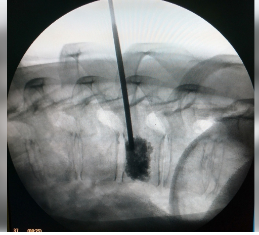 Женщина 45-лет поступила в больницу с жалобами на жгучие боли в грудном отделе позвоночника, беспокоящие на протяжении последних десяти лет. Из анамнеза известно, что пациентка обследовалась амбулаторно, выполнила МРТ грудного отдела, на котором выявилась гемангиома Th9 позвонка. При обращении к врачам по месту жительства в оперативном лечении было отказано. В больнице женщину осмотрел врач-нейрохирург, было принято решение об оперативном лечении. В марте этого года женщину прооперировали — сделали транскутанную вертебропластику Th9 позвонка костным цементом. Операция проводилась под местной анестезией в течение 25 минут нейрохирургом Арсланом Асылбаевым. Через час после операции пациентка была вертикализирована, сразу после операции отмечено отсутствие болей в грудном отделе, которые мучали её на протяжении последних десяти лет. Женщину выписали на вторые сутки после операции.