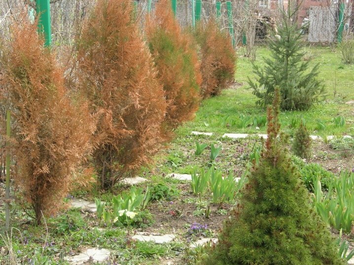 Садоводы любят высаживать тую на дачных участках. Живая изгородь из туи украшает участок. Ее можно сажать на клумбах, придавать растениям интересную форму. Туя в течение всего года сохраняет насыщенный зеленый цвет. Однако после зимы туя иногда желтеет. Если своевременно принять меры, то можно спасти растение. Пожелтение чаще всего происходит по следующим причинам: • Ожог от солнечных лучей. Тенелюбивые сорта растения следует защищать от прямых лучей солнце. В начале весны снег еще не растаял, а солнце может нанести вред. Молодые растения до исчезновения снега следует накрывать непроницаемым для лучей материалом. Для спасения поврежденного от ожога растения нужно интенсивно его поливать. • Избыток и недостаток воды. От скопления воды корневая система туи может намокнуть. Мокрые корни приводят к образованию плесени и вызывают пожелтение растения. Причиной такой ситуации может служить накопление воды после обильных осадков или близкое к поверхности расположение грунтовых вод. Необходимо