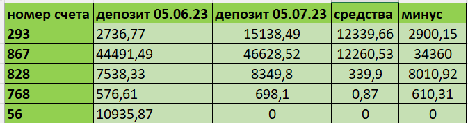 Всем привет! Подвожу итоги по всем счетам за период 05.06-05.07.23 Про все счета данные писать буду по порядку, как они в терминале расположены. Информация на 05.07.2023 Номер счета и сумма в центах, но я сами центы не буду , я считаю сколько долларов на депозите. 3996293 - 151 (здесь в основном usdcad, в просадке) перевела сюда средства с закрытого полностью счета (ниже есть отчет) 4111867 - 466 (здесь только gbpnzd) 5280828 - 83 (это партнерский,здесь EURJPY) немного прибавил в депозите, но в средствах очень сильно просел, часто думаю, что счет не выдержит 4137768 - 6 ( это тоже счет партнера, но был создан и веден исключительно на партнерские вознаграждения, мне комиссия идет за ее торговлю), тут ооочень большая просадка относительно суммы депозита. 5571056 - 0 (это мой основной счет, по которому была торговля , именно с него начался отчет по привидению всех счетов в порядок) здесь я торговала только EURUSD. На своем счете и на партнерских также закрывала минусы при достижении целев