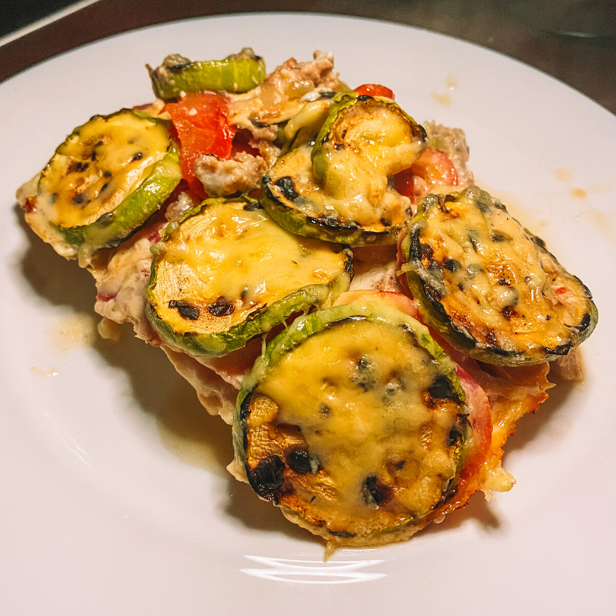 Привет, читатель! Сейчас сезон кабачков и я делаю много разнообразных блюд с ними! И сегодня я хочу поделиться рецептом простой и вкусной запеканки с фаршем! Это блюдо очень лёгкое и летнее, подойдет на любой приём пищи! Нам понадобится: Количество ингредиентов зависит от размера вашей формы, у меня она не большая (примерно как половика стандартного большого противня), потому мне хватило трёх не крупных кабачков и одного большого помидора. Итак, первым делом кабачок нарезаем кольцами и обжариваем на сухой сковороде с обеих сторон. Если хотите можно предварительно обвалять кабачки в муке, но я так не делала, чтоб блюдо не стало калорийным. Далее обжариваем на сковороде лук и фарш, сильно зажаривать не нужно, так как это всё ещё будет запекаться в духовке. Не забудьте немного посолить! Теперь в нашу форму для запекания укладываем слой кабачков (можно и не один слой), на него выкладываем фарш, далее нарезанный тонкими колечками помидор и сверху ещё слой кабачков. Всё немного солим. Далее