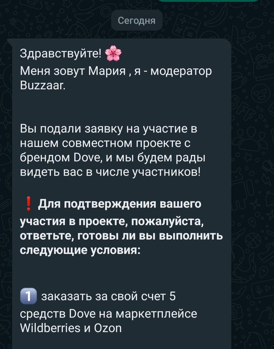 НЕДЕЛЯ ВСЕГО ПРОШЛА , А У МЕНЯ СНОВА ТЕСТИРОВАНИЕ)))) .ТО ЖДЕШЬ - НЕ ДОЖДЕШЬСЯ , А ТУТ ПОДРЯД !!! В ЭТОТ РАЗ МНЕ НЕОБХОДИМО ПРИОБРЕСТИ НА ОЗОН И ВАЙЛДБЕРРИС 5 продуктов DOVE. Я ПРИСЛАЛА ФОТО ТОВАРА С ЦЕНОЙ , МНЕ ПРИСЛАЛИ ССЫЛКУ НА ПРОДУКТОВЫЙ ОПРОС .ТЕПЕРЬ СНОВА ЖДУ ПОСЫЛОЧКИ .ОЗОН УЖЕ 2 НЕДЕЛЮ ПРЕДЫДУЩИЙ НЕ ВЕЗЕТ МНЕ, ВСЕ ПЕРЕНОСИТ ДАТЫ. В ПРОШЛОЕ ТЕСТИРОВАНИЕ Я ПОПАЛА ПОД АКЦИЮ на ОЗОН - "БАЛЛЫ ЗА ОТЗЫВ "-ПОЛУЧИЛА 155+155=310 БАЛЛОВ ,КОТОРЫМИ МОЖНО ОПЛАТИТЬ "25 %. .https://buzzaar.ru/ru/ О БУЗААР ПИСАЛА ЗДЕСЬ https://dzen.ru/a/Y6WZlRLsdUhedYNS?share_to=link&integration=site_desktop&place=layout