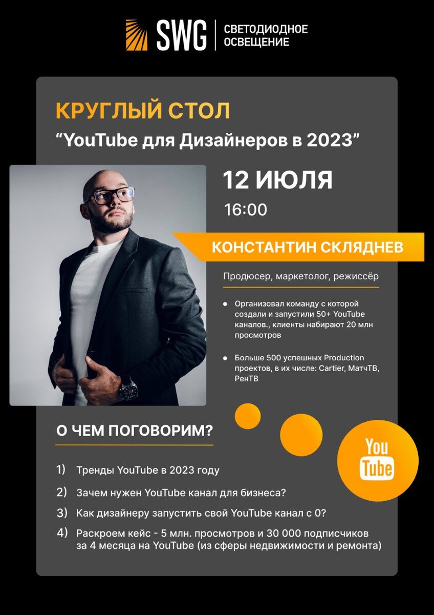 12 июля Ольга Заботкина (SWG) и Константин Скляднев приглашают дизайнеров интерьера и архитекторов на круглый стол на тему продвижения личного бренда и имени студии в YouTube. Спикер Константин Скляднев: — Продюсер, маркетолог, режиссер. — Организовал команду, с которой создал и запустил 50+ YouTube каналов, клиенты набирают 20 миллионов просмотров. — Более 500 успешных Production проектов, в их числе Cartier, МатчТВ, РенТВ. Тема Встречи: «YouTube для Дизайнеров в 2023» — Тренды YouTube в 2023 году. — Зачем нужен YouTube канал для бизнеса? — Как дизайнеру запустить свой YouTube канал с 0? — Раскроем кейс: 5 млн. просмотров и 30 000 подписчиков за 4 месяца на YouTube (из сферы недвижимости и ремонта). Начало в 16:00, конференц-зал «Кубатуры» (3-й этаж), Санкт-Петербург, ул. Фучика, 9. Основная часть встречи займет до 2 часов, желающие смогут продолжить общение с Константином. Количество мест ограничено. Регистрация по ссылке: https://swg-svet.timepad.ru/event/2493761/