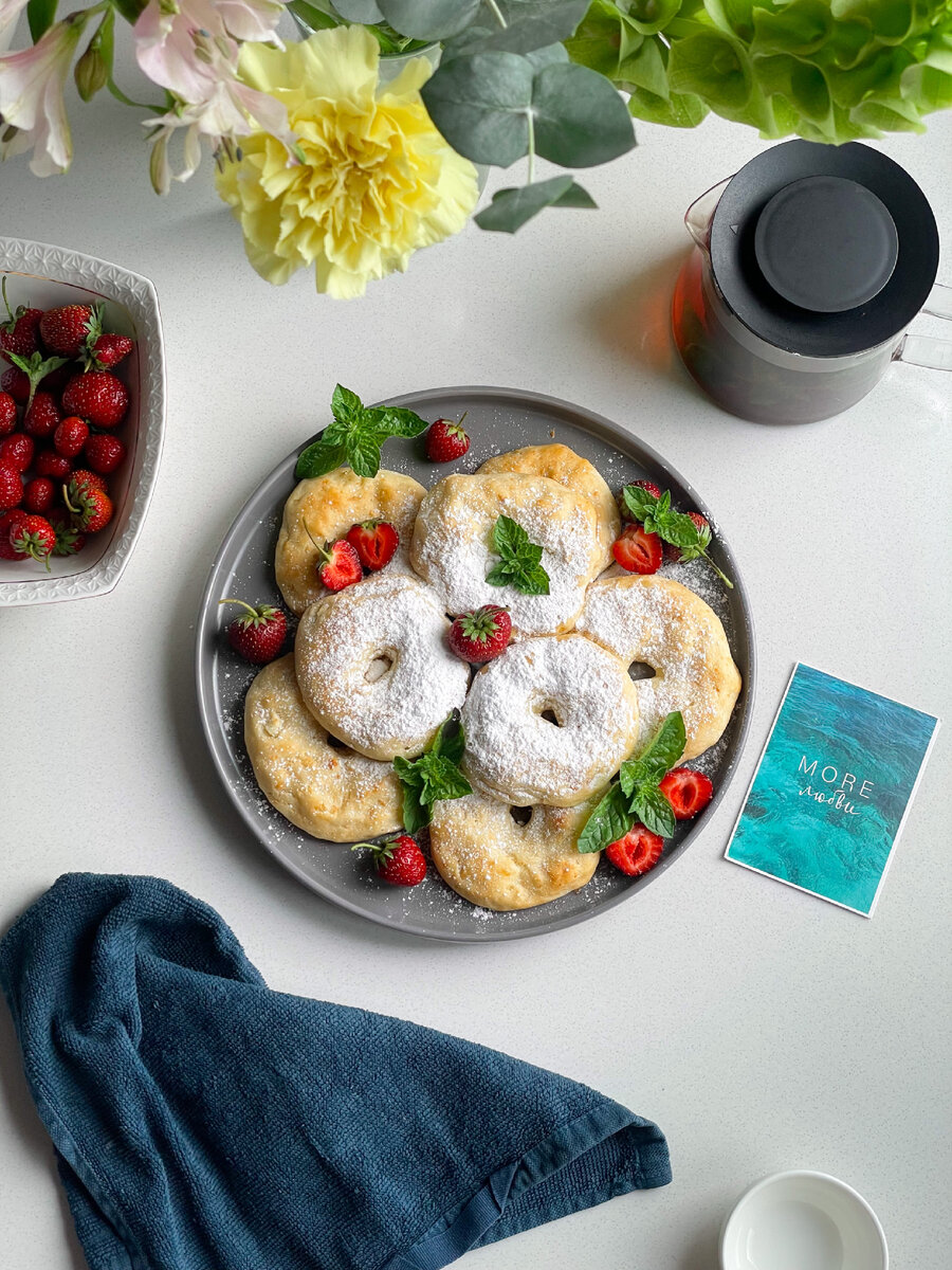 Вкусная, нежная, легкая выпечка из творога, попробуйте! Сегодня они у нас закончились до того как успели остыть)) Ингредиенты: Яйца взбить вилкой с сахаром и солью. Добавить творог, перемешать. Добавить муку, замесить тесто. Оно должно быть липким. Мокрыми руками отделить кусочек теста, слепить шарик и сделать отверстие в центре, чтоб получилось колечко, на видео показываю как делаю: Можно лепить и не колечки, а просто лепешки, как в анекдоте: не получаются блины, пеките комочки)))) Но колечки посимпатичнее 😁 Противень застелить пергаментом и выложить колечки. Выпекать в разогретой до 200 градусов духовке в течение 15-20 минут. Сильно румяниться они не будут, не ждите) Готовые колечки посыпать сахарной пудрой. Приятного аппетита)