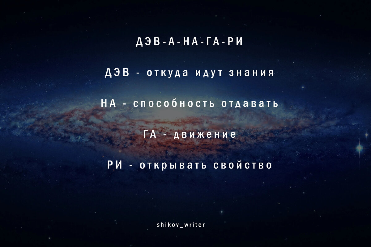 Язык - у древних было два языка 1) Санзар (сензар) - язык подражательных звуков и определение резонансного звучания например предмета, который человек легко определял, если у него было развито чувство звуковой меры. Человек с помощью звука мог преобразовать предмет. 2) Дэванагари - язык для общения с богом. По свидетельству старожилов, за счет выделения из русского языка греческого и санскрита он обнищал примерно на 34000 слов (Шимшук). А остальные значения современного русского языка поменяли свои значения. Сейчас люди с помощью современного языка не могут узнать свою настоящую культуру. ДЭВ-А-НА-ГА-РИ (Тюрин) ДЭВ - 9 бог (откудова идут знания) НА - способность отдавать ГА - движение РИ - открывать свойство Сейчас - Деванагари - буквально «божественное городское (письмо)») — разновидность индийского письма нагари, происходящего от древнеиндийского письма брахми. Разработан в древней Индии с I по IV век н. э. (неавторитетный источник) и регулярно использовалс