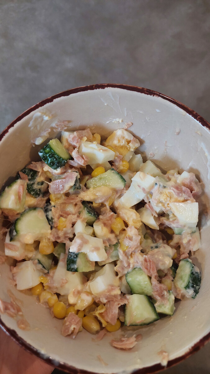 Простой и вкусный салат с тунцом, яйцом и огурчиком. Минимум ингредиентов, а результат всегда потрясающий. Салат получается сытным и очень аппетитным. Быстрое в приготовлении блюдо, когда нужно что-то приготовить на скорую руку. Ингредиенты на одного человека : • Тунец 60гр (я беру в собственном соку) • Огурец 1шт • Яйцо 1шт (вареное вкрутую) • Лук красный (по желанию) • Кукуруза консервированная 60гр • Греческий йогурт/сметана 3ч.л.(20гр) • Соль, специи по вкусу (Можно добавить айсберг, авокадо, оливки и т.д.) Способ приготовления : 1. Яйцо и огурец нарежьте кубиком. У тунца слейте жидкость, разомните вилкой и выложите в емкость вместе с яйцом и огурцом. Добавьте кукурузу, греческий йогурт и соль. Высокобелковый салат готов! Приятного аппетита😋