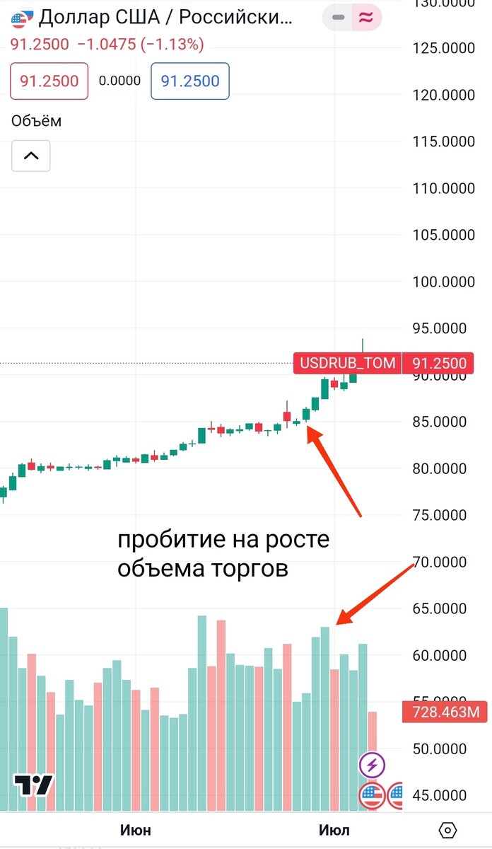 $€ Сегодня посмотрим наглядно, чем отличаются частные инвесторы от институциональных. Для этого рассмотрим текущий контракт на пару доллар/рубль. Он идёт под маркировкой Si-9:23. И так, начиная с недели от 26 июня, доллар пошёл в рост и пробил серьёзный уровень сопротивления, который находится примерно на уровне 85 рублей за доллар. При этом произошло увеличение объёмов торгов. Вы знаете что это значит? Должны знать, это же основа биржевой торговли.😊 Пробитие уровня сопротивления на увеличении объёма торгов и закрепление над уровнем - это явный сигнал продолжения движения. Это знают крупные инвесторы. А вот физики не все так осведомлены. И к тому же, частный инвестор зачастую менее терпелив, и старается зафиксировать любой минимальный профит. И это оправдано, когда цена двигается в коридоре. Но после выхода из границ коридора, нужно действовать иначе. Это и произошло на контракте si на прошлой неделе. Как только доллар вырос до 86-88, частные инвесторы стали закрывать свои лонги и