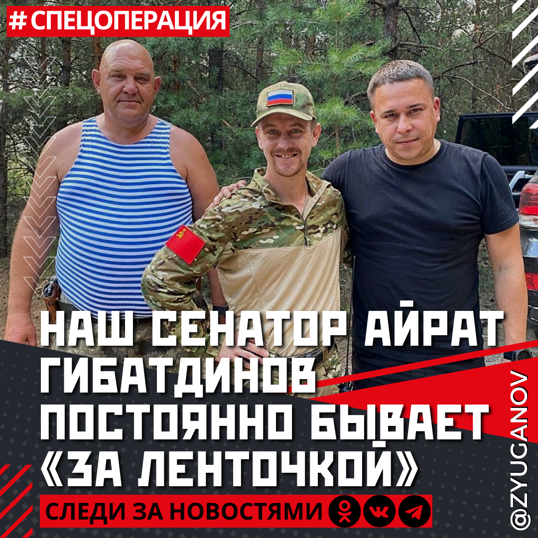 Наш сенатор Айрат Гибатдинов постоянно бывает «за ленточкой» и вместе с товарищами-коммунистами оказывает помощь нашим героическим ребятам, сражающимся со злом неонацизма за Русский мир.