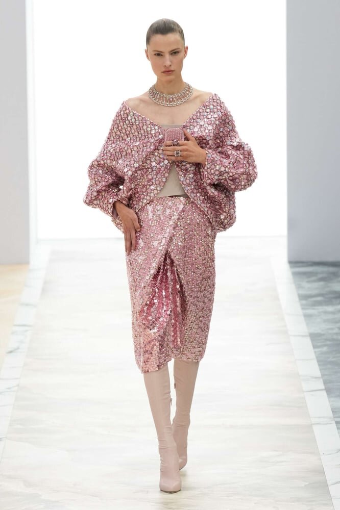 Попытка создать коллекцию Haute Couture на основе минимализма и простоты может показаться смелой и противоречивой. Однако британский дизайнер Ким Джонс без труда справляется с этим вызовом. Fendi представил утонченную интерпретацию женственности с чистыми и строгими линиями. Простые, благородные ткани легко облегали тело, и в этом всем читалась спокойная, ненавязчивая роскошь. Это было изящное и лаконичное представление, где простота одежды сопровождалась впечатляющей блеском ювелирных украшений. Вторая кожа, прилегающая к телу, силуэты их играли в очертаниях драпировок и несимметричности. Линии горловины смещались вбок, а в одном платье сочетались короткий и длинный рукав. "Нюдовые" оттенки создавали эффект матирования, а атласная отделка добавляла монохромным образам яркие акценты алого и бирюзового цвета. На подиуме также были представлены многослойные обволакивающие ансамбли с объемными жакетами, воплощавшие скромное обаяние буржуазии. Гардероб, созданный для основных клиентов Fe