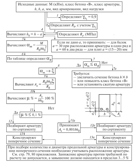 Алгоритм определения площади сечения продольной рабочей арматуры для изгибаемых элементов прямоугольного сечения с одиночной арматурой