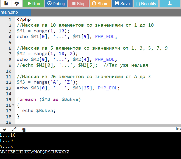 Здесь мы создаём массив $M1 и выводим на экран первый и последний элементы созданного массива. Поскольку индексация начинается с нуля, то первый элемент будет в $M1[0], а последний - в $M1[9]. Если кто не знает, то PHP_EOL переводит курсор на новую строку.