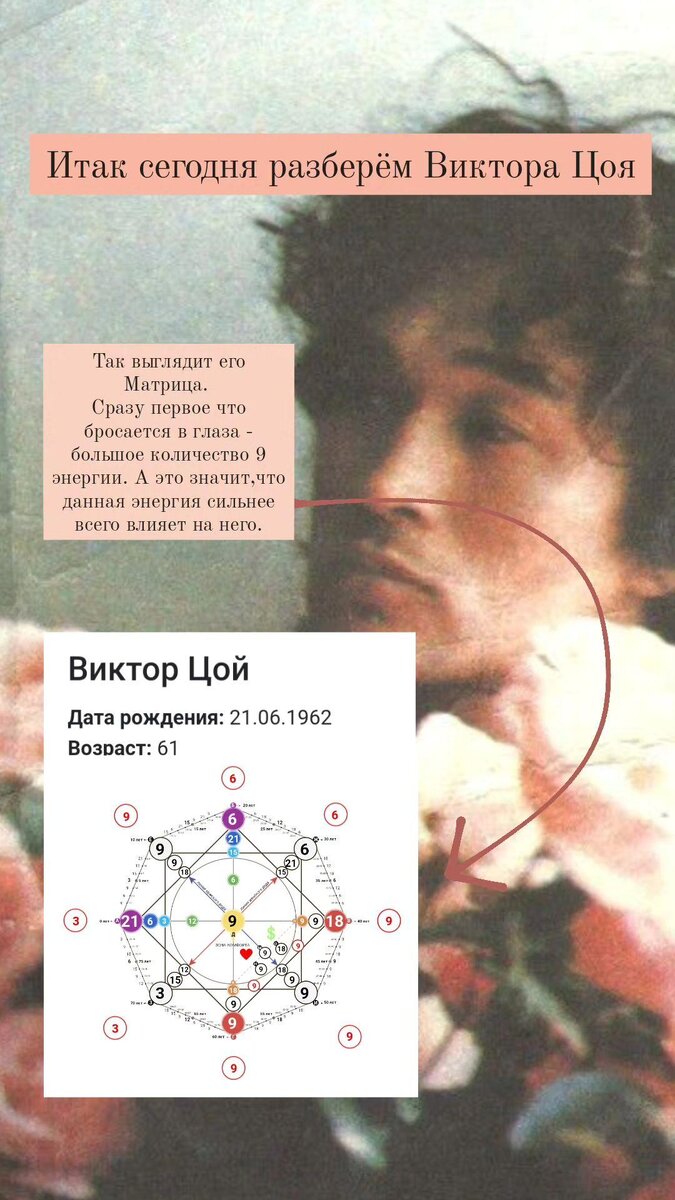 Сегодня мы с вами разберём прекрасного музыканта Виктора Цоя. Любой разбор Матрицы Судьбы я начинаю с кармического хвоста. Напомню, что кармический хвост. Это задачи прошлых воплощений, которые не были отработаны. Эти энергии изначально в минусе. Проработав кармический хвост, у нас появляетея сильный фундамент. У Виктора Цоя кармический хвост 9-9-18. В ПРОШЛОЙ ЖИЗНИ: ● В прошлой жизни человек обладал какими-то знаниями, но не передал их. ● С помощью своих знаний делал зло другим людям. ● Могли давать обеты, обет безбрачия, безденежья, отказ от любви во имя служения, отказ от секса В ЭТОЙ ЖИЗНИ: ● Страх передачи знаний ("боюсь создавать себе конкурентов") или "мои знания никому не нужны. ● Может быть страх учить. Важно его проработать. ● Возможна гордыня из-за знаний. ЗАДАЧИ: ● Обладателю матрицы важно принять, что его душа опытная и мудрая. Для этого важно научиться прислушиваться к своей интуиции, научиться слушать людей, не перебивать, учиться анализировать различные точки зрения. ●