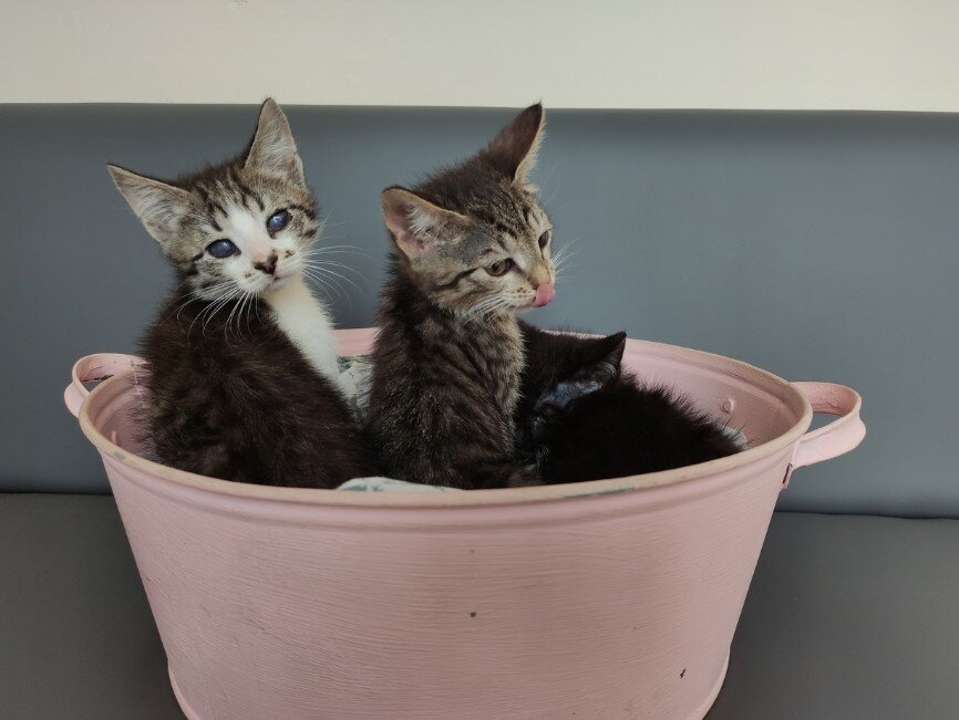 Мы писали про эту котосемью с Янаула здесь и еще позже. Вкратце, малышей и их маму обнаружили под крыльцом продуктового магазина, где, потом их маму и самих подрастающих котят, каждый день кормила женщина. Пока котят кошка кормила сама и они не выходили из под крыльца, хозяйка магазина ничего не говорила, но когда малыши начали выходить на улицу и начали привлекать внимание, она поставила ульмиматум кормящей женщине, что, либо эта женщина куда-то забирает их, либо она сама "денет их куда-надо" Сейчас уже точно известно, что двое котят абсолютно слепы, повезло только одной девочке, ее зрение спасти удалось. Всему виной герпесвирусная инфекция, именно она съела глаза малышей. Их мама, хотя визуально этого и не видно, является носителем инфекции, видимо когда-то перенесла ее без лечения, и бяка так и осталась в ней. И тогда, под свое кураторство забрала их Пермский волонтер Юля, за что ей Спасибо!!! Расстояние от Янаула до Перми 340 км, ехать почти 5 часов. В Янауле практически нет воло