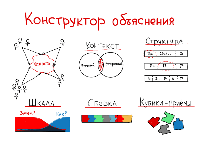 Главная польза конструктора в наличии множества вариантов деталей-кубиков. Комбинируя кубики можно собирать разные модели, под разные задачи. Именно из тренировки и появиться ваше искусство объяснения. В качестве кубиков будут рассмотрены разные приёмы привлечения внимания, поддержания интереса, упрощения понимания.