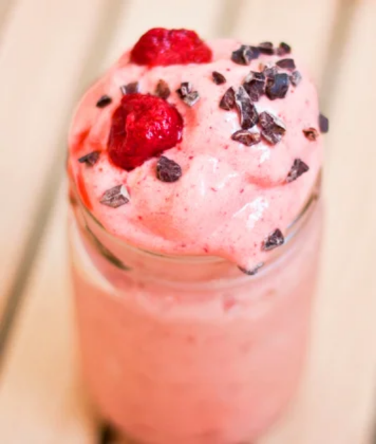 Замороженные бананы нарезать мелкими кусочками, взбить в мощном блендере, добавить к ним ягоды, снова чуть взбить, переложить смесь в красивую баночку или любую другую посуду, сверху украсить шоколадной стружкой или нибсами и цельными ягодами. Десерт готов.