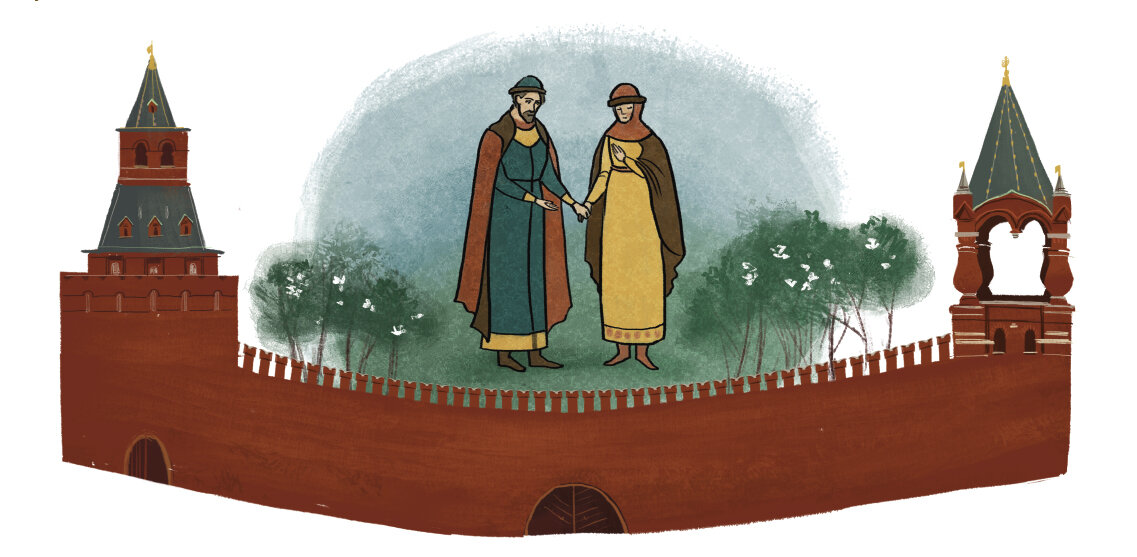 …Когда вернулся Петр в Муром, узнал, что брат его Павел умирает. И вскоре отошел он ко Господу, оставив свое княжество любимому брату. А Петр тем временем вновь покрылся струпьями с ног до головы — от того единого, что не был смазан целительной мазью по указу девы Февронии. Потужил-погоревал князь, посоветовался с мудрым своим слугой Евстратием и, собрав посольство великое, с повинной головой поехал к невесте в Рязанское княжество. Простила его премудрая дева, исцелила и пошла с ним под венец. А когда люди увидели ее дивно наряженную в светлые подвенечные одежды, все удивились и возрадовались красоте ее и тому, что обрел князь Петр такое сокровище себе в жены. Так что была великая радость в граде Муроме.