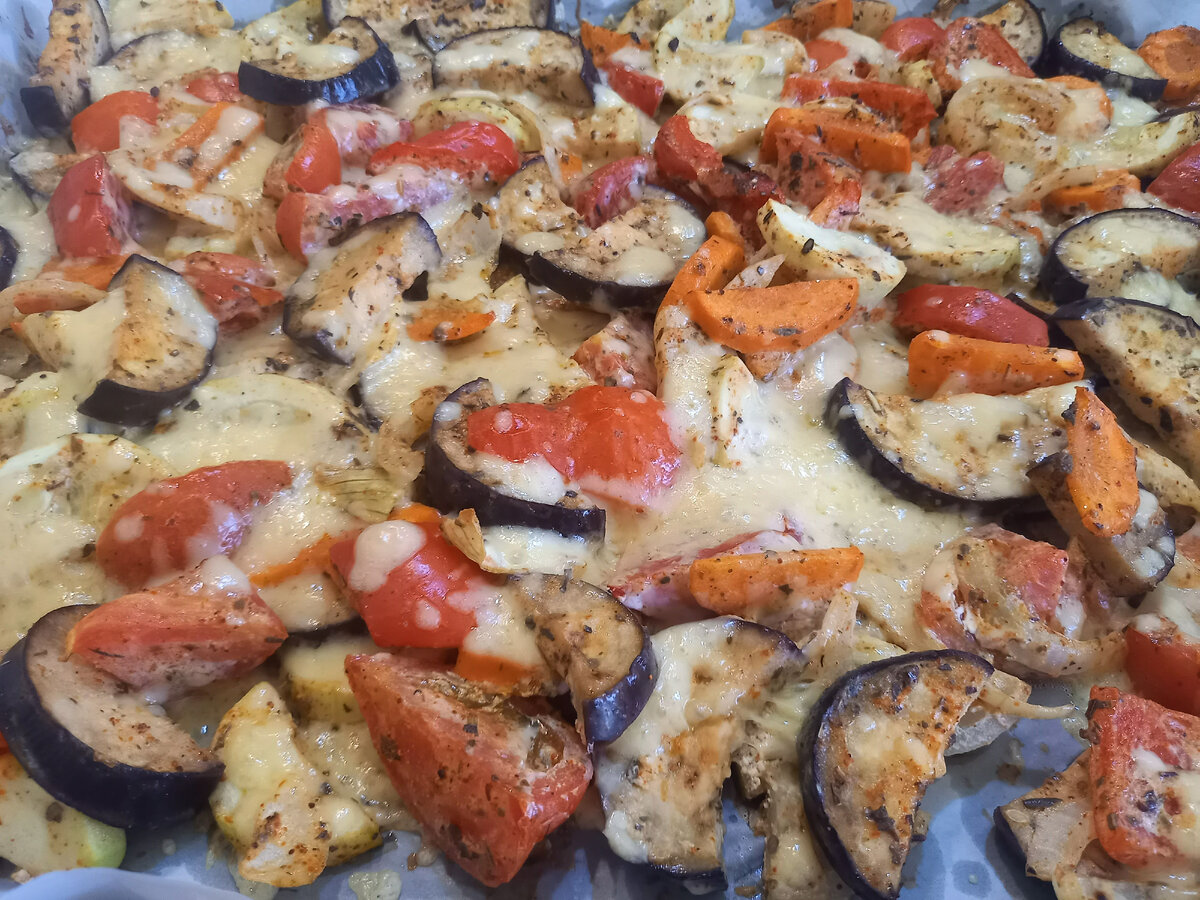 ОВОЩИ в сметанном соусе. Получается очень очень вкусно, а главное-полезно. Режу на кусочки: -1 кабачок -1 баклажан -1 луковица -1 помидор -1 перец -1 морковка Перемешать в большой миске овощи, добавить 1 ч.л прованских трав, 1 ч л паприки сладкой, 1 ч л сухого чеснока+ соль+ 3-4 ст ложки сметаны, и 3 ст ложки оливкового масла. Дать постоять 20мин, чтобы пропиталось. Застелить Хорошей ! пергаментной бумагой и распределить овощи. Запекать 25мин при t 180гр, затем посыпать любым сыром и еще 10мин. к этому блюду вы можете сделать любой вариант мяса или есть самостоятельно. И так же можно не добавлять сыр, тоже будет вкусно.
