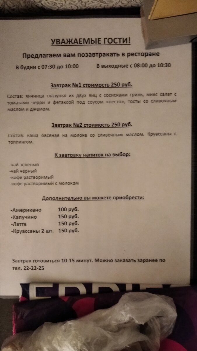 Встав около 8 утра, мы спустились позавтракать. Отель предлагает два варианта. В принципе, неплохо, но стоит учесть, что эти два варианта постоянны, то есть не меняются. Если живете неделю, только это и возможно заказать. Немного однообразно получается.