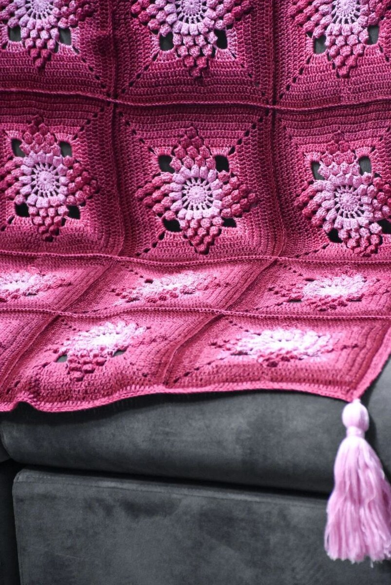 Невероятно красивый плед я встретила на просторах интернета. В каждом мотиве одинаковый переход цвета и он мне очень нравится. Размер покрывала 200×120 см и расход 7 мотков по 150 грамм. На сайте указано, что пряжу надо перематывать в 5 клубочков. Таким образом вязать мотив меняя цвете нити каждые 2 ряда. Círculo Prism 9666 оттенок малина 50% хлопрк 50% акрил 150гр 600м. Расход 7 мотков. Крючок 3 мм. Если вам понравилась эта статья оставьте свой комментарий. Магазин пряжи ВЯЗАНЫЙ.РФ
