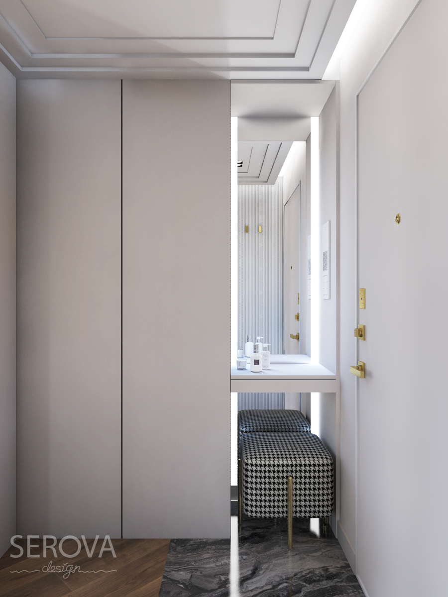Современная квартира для молодой семьи с золотыми акцентами. ЖК Новая Звезда, Москва, 68 кв.м. Квартира разработана для молодой семьи с двумя девочками. Сочетание лаконичных золотых элементов и благородного серого фона стало основой интерьера. Здесь все продумано и детализировано до мелочей В небольшом холле создается ощущение чистого пустого пространста, но при этом есть все необходимое. За фасадами в цвет стен стрыт не только гардероб для верхней одежды, но и полноценный постирочный шкаф. Зеркало в пол с подсветкой уведичивает пространство и наполняет его светом. Пуф на золотых ножках с контрастной тканью. Центральным элементом стала интерьерная картина с золотой поталью, размещенная на рельефной стене цвета антрацит Двух линейная кухня. Основные фасады так же выполнены в цвет стен и являются лишь фоном для золотых фасадов, которые благодаря свету от панарамного окна выглядят мягко и актуально. Золотые светильники и элементы мебели дополняют их В гостиной расположился комфортный дива