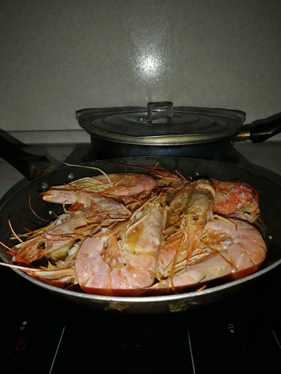 На юге обожаю баловаться лангустинами - это такие огроменные креветки, даже крупней королевских. Конечно, и голова у них огромная, но и мяско нежное-нежное, уже не совсем креветочный вкус, но все равно что-то такое очень вкусное. Итак, нам нужны сковорода, лангустины, чеснок и сливочное масло. Готовим не более 10 минут, иначе лангустины станут жёсткими. Прогреваем сковороду и на неё лангустинов. Когда они немного прогреются и начнут жарится, добавляем порезанный чеснок и сверху кладём сливочное масло. Чесночек отдаёт аромат, масло проникает в лангустина.... Ммммм
