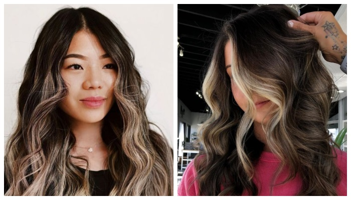 Чёрные волосы с мелированием — культовый тренд, существующий уже давно. Он известен завораживающим контрастом смешивания более светлых оттенков с насыщенной основой. Это поразительное сочетание цветов может подчеркнуть определенные особенности ваших волос: текстуру, объем и даже длину. Брюнетки взяли на вооружение эффект солнечного поцелуя. Излучайте скромную, но сексуальную энергию с помощью длинных чёрных волос со светлыми бликами цвета корицы. Обратите внимание, как красиво светлые локоны могут подчеркнуть ваши чёрные пряди и волны. Они способны контурировать ваши черты лица, рисуя ленты более светлых оттенков вокруг его овала. Чёрные волосы со светлыми бликами знойного эспрессо — отличный способ добавить акцентов к вашим темным волосам, не меняя кардинально образ. Предпочитаете натуральный цвет волос? Мелирование песочным блондом может осветлить волосы до нужного оттенка и придать волосам кокетливую игривость, как на этом фото. Красивые сочные локоны с темно-коричневым балаяжем осв