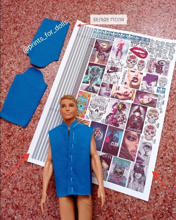 Ну так вот! Мне нужно было сделать белые полоски типа «адидас» на спортивном костюме из синего трикотажа для Кена. И во время процесса меня тогда осенило - термотрансферная бумага для темных тканей - это ж белая непрозрачная пленочка. Если её нарезать полосками - чем не способ наклейки белых лампасиков на ткань?!..