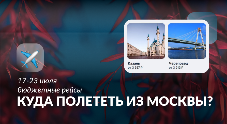Собрали предложения перелетов по России на следующей неделе. С 17 по 23 июля выгодно лететь в Нижний Новгород, Казань и Череповец. Все рейсы прямые, кроме них можно улететь ещё в 5 городов менее чем за 5000 рублей в одну сторону. Напишите в комментариях города, которые вам интересны Ни разу не были в Татарстане? Это ваш шанс. В среду стоимость перелёта будет чуть больше 2800 рублей. В воздухе проведете 1 час 35 минут. Пора знакомиться с городом на Волге, знаменитой местной мечетью и пробовать чак-чак. Посмотреть доступные варианты билетов можно по ссылке ниже https://aviasales.tp.st/DsqMrVq6 Рейсы в Казань из Москвы начинаются с 3564 рубля в одну сторону Татарстан начинается с Казани, бешбармака и культуры. Приехать можно в любое время и найти, чем заняться. Составили для вас список мест для посещения. Всего 35 позиций без лишних восторгов и описаний, чтобы составить первое впечатление. Самая дешевая цена в Череповец от авиакомпании Северсталь начинается с 3913 рублей, полетите в су