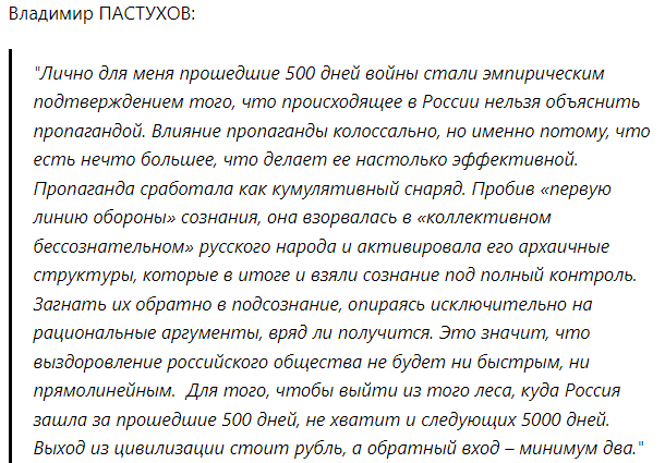 Сергей МЕДВЕДЕВ: Здесь снова с ним полностью согласен. В.йна - не морок, не затмение, .ойна - великий проявитель того, что мы и так знали, но боялись себе в этом признаться. С этой глубинной архаикой работали Мамлеев, Балабанов, Луцик и Саморядов. Но теперь она вышла на поверхность, и спрятать ее за ширмой культуры уже не получится. Теперь становится понятно, что это лишь первые 500 дней - и я не про войну, я про Россию
